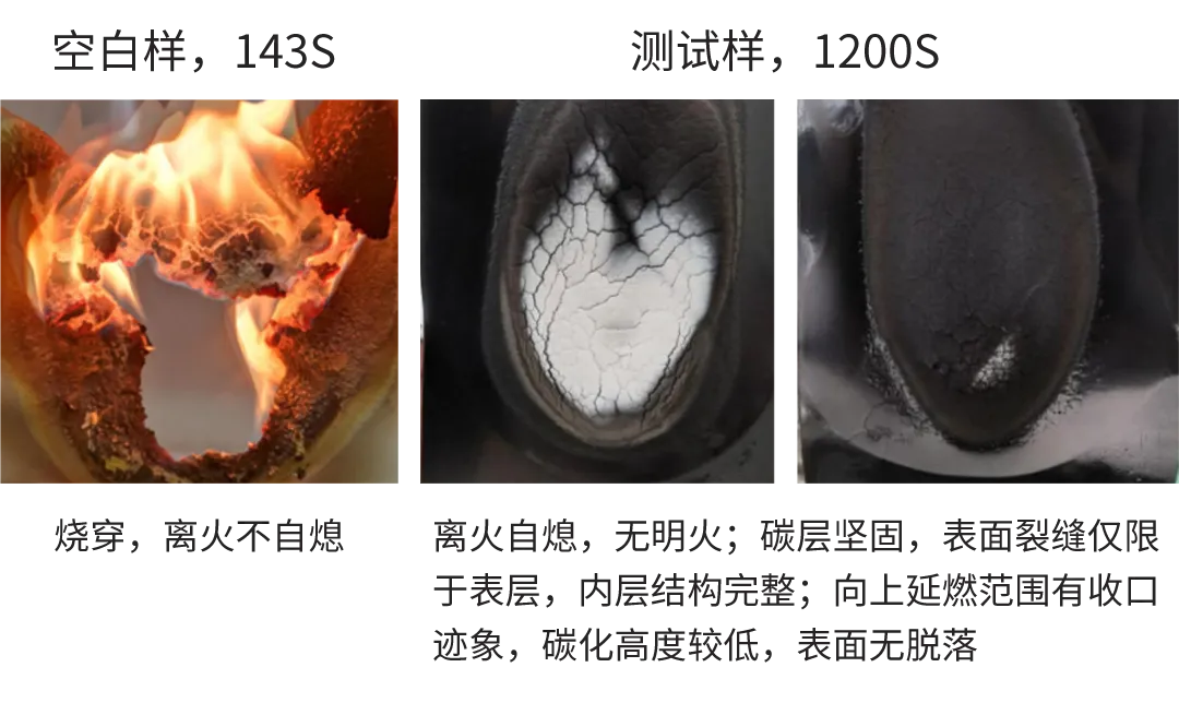 添加 2%的 Javachem®CT,燃烧时,材料表面形成致密、坚固的炭层,阻隔火焰和热量,显著提升阻燃性能。